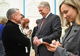 Церемония вручения государственных наград в Екатерининском зале Кремля. Заместитель руководителя администрации президента России, пресс-секретарь президента Дмитрий Песков (справа) и телеведущий Владимир Соловьев на церемонии.
