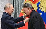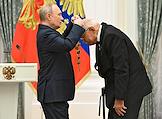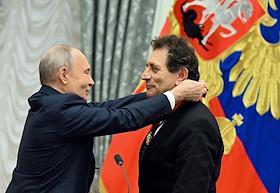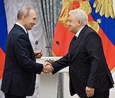 Церемония вручения государственных наград в Екатерининском зале Кремля. Президент России Владимир Путин (слева) и ректор Театрального института имени Б.В. Щукина Евгений Князев во время церемонии.