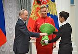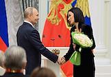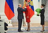 Церемония вручения государственных наград в Екатерининском зале Кремля. Президент России Владимир Путин (слева) и певица, актриса, общественный деятель Елена Север (Киселева) во время церемонии.