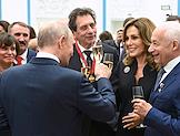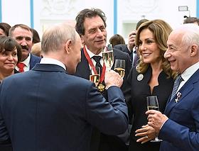 Церемония вручения государственных наград в Екатерининском зале Кремля. Справа налево: президент государственного учреждения культуры города Москвы "Московский международный дом музыки" Владимир Спиваков, телеведущая Сати Спивакова, ректор Театрального института имени Б.В.Щукина Евгений Князев и президент России Владимир Путин на церемонии. Спиваков Владимир, Президент государственного учреждения культуры города Москвы "Московский международный дом музыки" Спивакова Сати Путин Владимир, Президент России