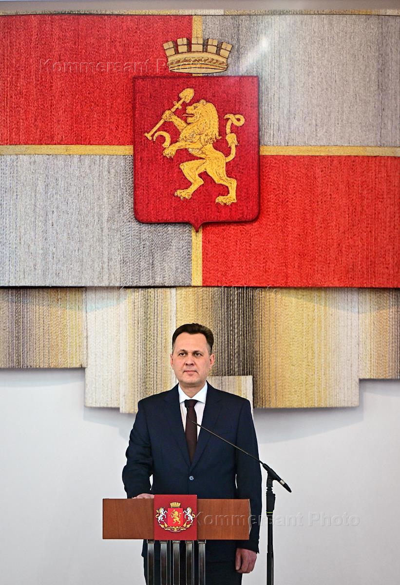 Церемония инаугурации мэра Красноярска Сергея Верещагина в овальном зале администрации города Красноярска. Мэр Красноярска Сергей Верещагин во время церемонии.