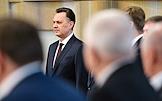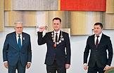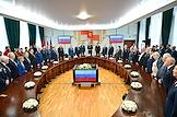 Церемония инаугурации мэра Красноярска Сергея Верещагина в овальном зале администрации города Красноярска. Мэр Красноярска Сергей Верещагин (в центре), заместитель председателя Красноярского городского Совета депутатов Андрей Козиков (справа) во время церемонии.