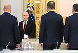 Заседание Государственного совета России, посвященное вопросам подготовки кадров для экономики России, в Георгиевском зале Большого Кремлевского дворца. Справа налево: губернатор Запорожской области Евгений Балицкий, глава Республики Адыгея Мурат Кумпилов, губернатор Санкт-Петербурга Александр Беглов и глава Луганской Народной Республики (ЛНР) Леонид Пасечник перед началом заседания.