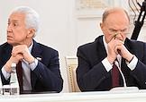 Заседание Государственного совета России, посвященное вопросам подготовки кадров для экономики России, в Георгиевском зале Большого Кремлевского дворца. Руководитель фракции "Единая Россия" в Государственной думе (ГД) России Владимир Васильев (слева) и лидер КПРФ, руководитель фракции КПРФ в ГД России Геннадий Зюганов (справа) перед началом заседания.