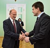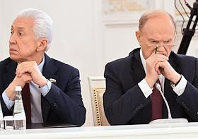 Заседание Государственного совета России, посвященное вопросам подготовки кадров для экономики России, в Георгиевском зале Большого Кремлевского дворца. Лидер КПРФ, руководитель фракции КПРФ в Государственной думе России Геннадий Зюганов (слева) и губернатор Красноярского края, председатель комиссии Госсовета России по направлению "Технологическое лидерство" Михаил Котюков (справа) перед началом заседания.