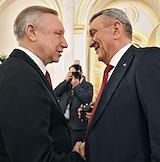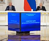 Заседание Государственного совета России, посвященное вопросам подготовки кадров для экономики России, в Георгиевском зале Большого Кремлевского дворца. Губернатор Санкт-Петербурга Александр Беглов (слева) и глава Республики Северная Осетия - Алания Сергей Меняйло (справа) перед началом заседания.
