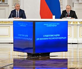 Заседание Государственного совета России, посвященное вопросам подготовки кадров для экономики России, в Георгиевском зале Большого Кремлевского дворца. Председатель Государственной думы России Вячеслав Володин (слева) и президент России Владимир Путин (справа) во время заседания.