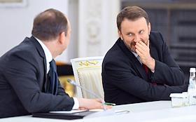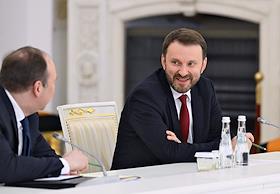Заседание Государственного совета России, посвященное вопросам подготовки кадров для экономики России, в Георгиевском зале Большого Кремлевского дворца. Заместитель руководителя администрации президента России, член президиума Госсовета России Максим Орешкин (справа) и руководитель администрации президента России, председатель комиссии Госсовета России по обеспечению согласованного функционирования и взаимодействия органов публичной власти Антон Вайно (слева) перед начало заседания.