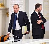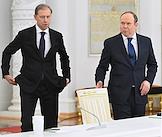Заседание Государственного совета России, посвященное вопросам подготовки кадров для экономики России, в Георгиевском зале Большого Кремлевского дворца. Первый заместитель председателя правительства России Денис Мантуров (слева) и руководитель администрации президента России, председатель комиссии Госсовета России по обеспечению согласованного функционирования и взаимодействия органов публичной власти Антон Вайно (справа) перед начало заседания.