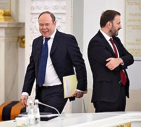 Заседание Государственного совета России, посвященное вопросам подготовки кадров для экономики России, в Георгиевском зале Большого Кремлевского дворца. Заместитель председателя правительства России Дмитрий Чернышенко (слева) и помощник президента России Андрей Фурсенко (справа) перед началом заседания.