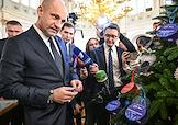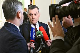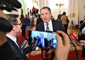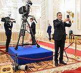 Заседание Государственного совета России, посвященное вопросам подготовки кадров для экономики России, в Георгиевском зале Большого Кремлевского дворца. Губернатор Белгородской области Вячеслав Гладков во время общения с журналистами перед началом заседания.