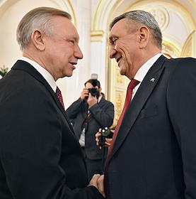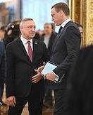 Заседание Государственного совета России, посвященное вопросам подготовки кадров для экономики России, в Георгиевском зале Большого Кремлевского дворца. Губернатор Санкт-Петербурга Александр Беглов (слева) и губернатор Рязанской области Павел Малков (справа) перед началом заседания.