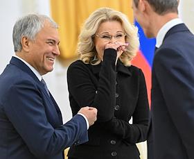 Заседание Государственного совета России, посвященное вопросам подготовки кадров для экономики России, в Георгиевском зале Большого Кремлевского дворца. Слева направо: председатель Государственной думы России Вячеслав Володин, заместитель председателя правительства России Татьяна Голикова и заместитель председателя правительства России – руководитель аппарата правительства России Дмитрий Григоренко перед началом заседания.