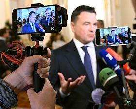 Заседание Государственного совета России, посвященное вопросам подготовки кадров для экономики России, в Георгиевском зале Большого Кремлевского дворца. Губернатор Московской области, председатель комиссии Госсовета России по направлению "Экономика данных" Андрей Воробьев во время общения с журналистами перед началом заседания.