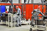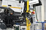 Церемония запуска производства тяжелых полноприводных грузовых автомобилей БАЗ на производственной площадке в Шушарах. Жанровая фотография. Рабочие в цехе.