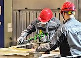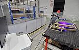 Церемония запуска производства тяжелых полноприводных грузовых автомобилей БАЗ на производственной площадке в Шушарах. Жанровая фотография. Рабочий во время обработки кузовных деталей.