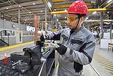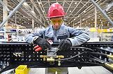 Церемония запуска производства тяжелых полноприводных грузовых автомобилей БАЗ на производственной площадке в Шушарах. Жанровая фотография. Рабочий в цехе сборки.