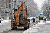 Жанровая фотография. Снегопад в городе. Трактор с ковшом коммунальных служб города во время уборки снега.