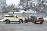 Жанровая фотография. Снегопад в городе. Автомобильная авария на дороге с участием такси .