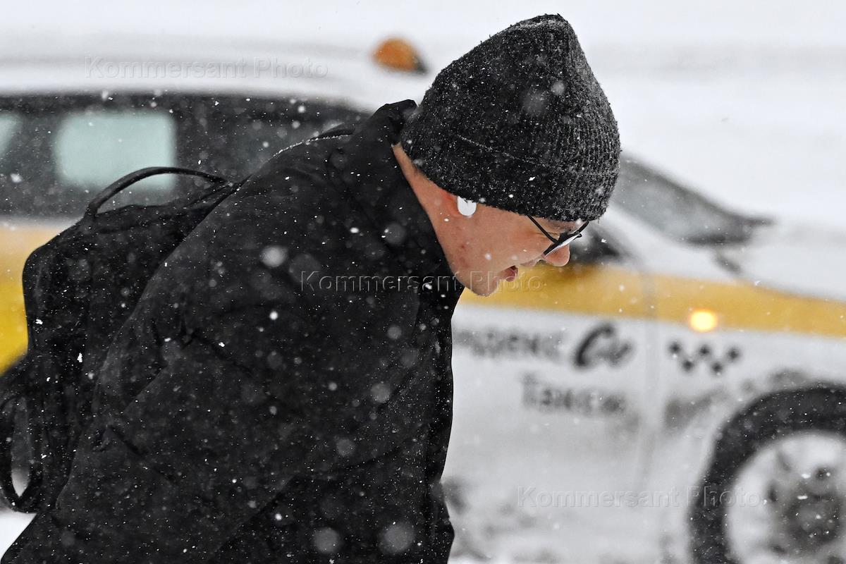 Виды Москвы во время снегопада. Жанровая фотография. Мужчина без куртки бежит во время снегопада.