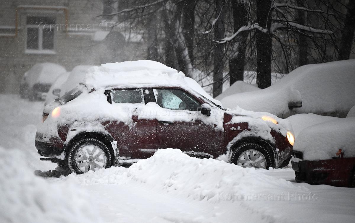 Виды Москвы во время снегопада. Жанровая фотография. Заснеженные автомобили во дворе жилого дома.