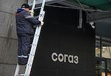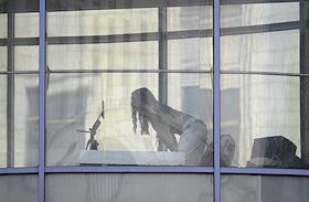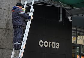 Виды Москвы. Офис АО СОГАЗ на проспекте Академика Сахарова. Жанровая фотография. Рабочий во время уборки снега с козырька над входом в здание.