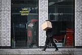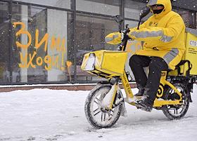 Виды Москвы во время снегопада. Жанровая фотография. Курьер сервиса доставки "Яндекс. Еда" на фоне надписи "Зима уходи!".