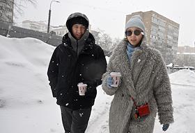 Жанровая фотография. Прохожие на улице во время снегопада.
