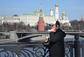 Жанровая фотография. Мужчина с мобильным телефоном на мосту на фоне Кремля.