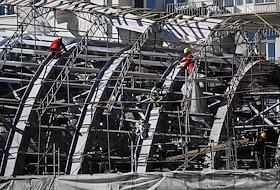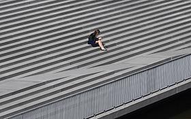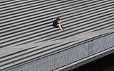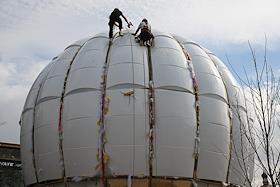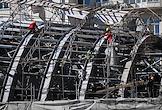 Жанровая фотография. Рабочие в альпинистском оборудовании во время сборки купола над зданием.
