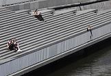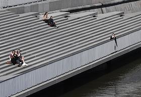 Жанровая фотография. Люди сидят на ступеньках на набережной.