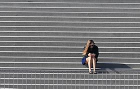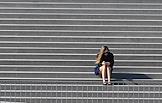 Жанровая фотография. Девушка сидит на ступеньках лестницы на набережной.