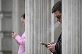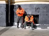 Жанровая фотография. Рабочие с мобильными телефонами у здания.