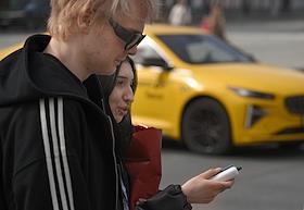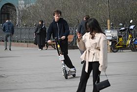 Жанровая фотография. Молодой человек едет на арендном электросамокате компании "Яндекс Go" по тротуару.