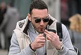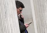 Жанровая фотография. Мужчина курит сигарету на улице и читает в мобильном телефоне.