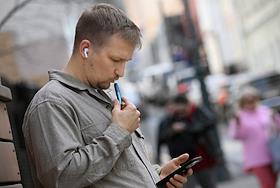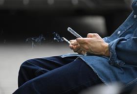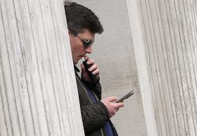 Жанровая фотография. Мужчина курит электронную сигарету на улице и читает в мобильном телефоне.