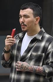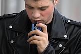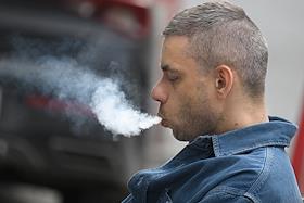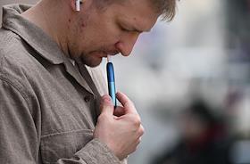 Жанровая фотография. Молодой человек курит электронную сигарету на улице.