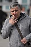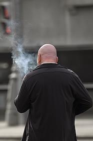 Жанровая фотография. Мужчина курит сигарету на улице и выпускает дым.