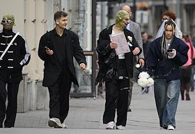 Жанровая фотография. Молодые люди в масках зомби идут по улице города.
