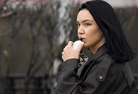 Жанровая фотография. Девушка курит электронную сигарету на улице.