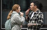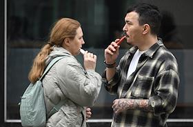 Жанровая фотография. Молодой человек и девушка курят электронные сигареты на улице.