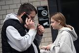 Жанровая фотография. Молодые люди гуляют по улице. Девушка курит электронную сигарету.