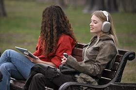 Жанровая фотография. Девушка слушает музыку в наушниках по мобильному телефону.