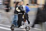Жанровая фотография. Девушки вдвоем едут на арендном электросамокате по улице города.
