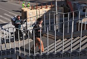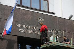 Жанровая фотография. Рабочие на подъемной платформе ремонтируют вывеску на здании Министерства транспорта России.