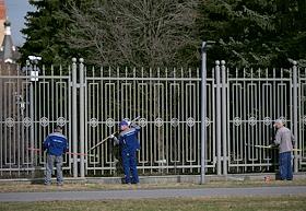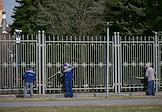 Жанровая фотография. Сотрудники коммунальной службы города красят решетку забора в сквере.