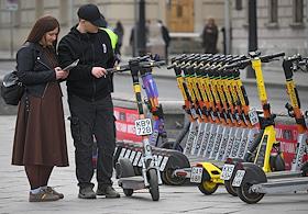 Жанровая фотография. Стоянка арендных электросамокатов компании Whoosh на улице города.
