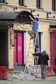 Жанровая фотография. Мужчина на лестнице-стремянке красит решетку навеса над входной дверью.