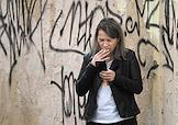 Жанровая фотография. Девушка курит электронную сигарету на улице и читает в мобильном телефоне.