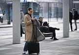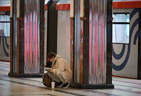 Жанровая фотография. Девушка смотрит на экран мобильного телефона на платформе станции метрополитена.